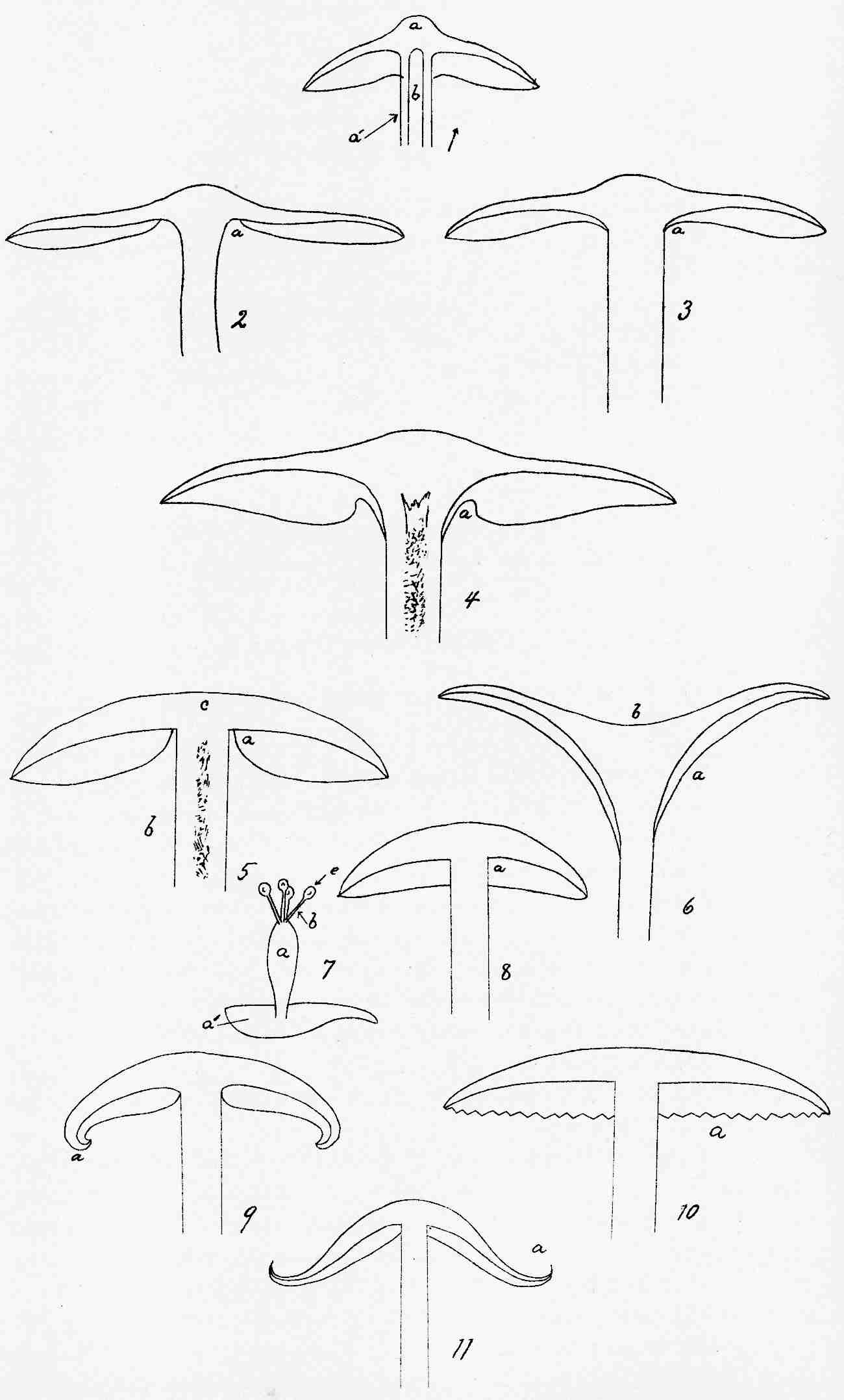 In Plate A is presented a sketch of the common field mushroom, Agaricus campester. Fig. 1 represents the mature plant; Fig. 2, a sectional view of the same; Fig. 3, the basidia, club-shaped cells from the summit of which proceed the slender tubes called sterigmata, which support the spores—highly magnified; Fig. 4, the sterigmata; Fig. 5, the mycelium, highly magnified, supporting immature mushrooms; Fig. 6, the spores as shed from an inverted mushroom cap; Fig. 7, spores magnified.