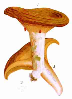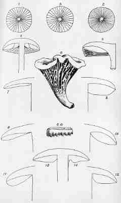 In the Thelephorei, the lower surface of the cap presents neither gills, pores, nor spines, but instead the hymenium covers an uneven or slightly wrinkled surface, partially striate, sometimes obscurely papillose. The plants of this order assume a great variety of shape, from that of a perfect cup with a central stem to an irregularly and much branched frond. They are generally dry and tough. Very few are recommended as edible. Prof. Peck says of this order that probably no edible species will be found in any of its genera outside of the genus Craterellus.