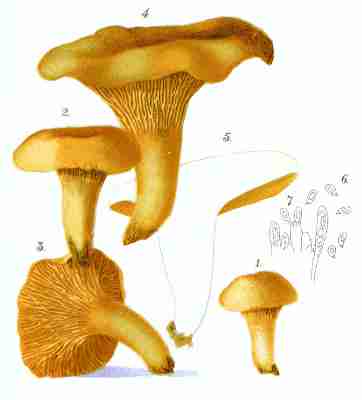The mycelium of mushrooms or the mushroom spawn is usually white, but is also found yellow, and even red. It is distinguished by some writers as nematoid, fibrous, hymenoid, scleroid or tuberculous, and malacoid. The nematoid mycelium is the most common. Creeping along on the surface of the earth, penetrating it to a greater or less depth, developing in manure among the débris of leaves or decayed branches, always protected from the light, it presently consists of very delicate filamentous cells more or less loosely interwoven, divided, anastomosing in every direction and often of considerable extent.