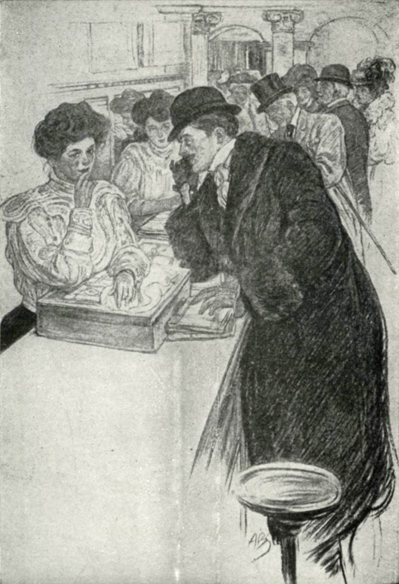 Two of the most "refined" women in the store—a forelady and a cashier—had a few "swell gentlemen friends" with whom they now and then dined. Once they included Nancy in an invitation. The dinner took place in a spectacular café whose tables are engaged for New Year's eve a year in advance. There were two "gentlemen friends"—one without any hair on his head—high living ungrew it; and we can prove it—the other a young man whose worth and sophistication he impressed upon you in two convincing ways—he swore that all the wine was corked; and he wore diamond cuff buttons. This young man perceived irresistible excellencies in Nancy. His taste ran to shop-girls; and here was one that added the voice and manners of his high social world to the franker charms of her own caste. So, on the following day, he appeared in the store and made her a serious proposal of marriage over a box of hem-stitched, grass-bleached Irish linens. Nancy declined. A brown pompadour ten feet away had been using her eyes and ears. When the rejected suitor had gone she heaped carboys of upbraidings and horror upon Nancy's head.