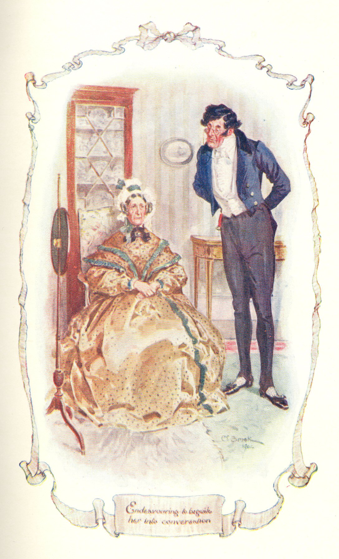 p. 12It was very good of Miss Jenkyns to do this; for I had seen that, a little before, she had been a good deal annoyed by Miss Jessie Brown’s unguarded admission (à propos of Shetland wool) that she had an uncle, her mother’s brother, who was a shop-keeper in Edinburgh. Miss Jenkyns tried to drown this confession by a terrible cough—for the Honourable Mrs Jamieson was sitting at a card-table nearest Miss Jessie, and what would she say or think if she found out she was in the same room with a shop-keeper’s niece! But Miss Jessie Brown (who had no tact, as we all agreed the next morning) would repeat the information, and assure Miss Pole she could easily get her the identical Shetland wool required, “through my uncle, who has the best assortment of Shetland goods of any one in Edinbro’.” It was to take the taste of this out of our mouths, and the sound of this out of our ears, that Miss Jenkyns proposed music; so I say again, it was very good of her to beat time to the song.