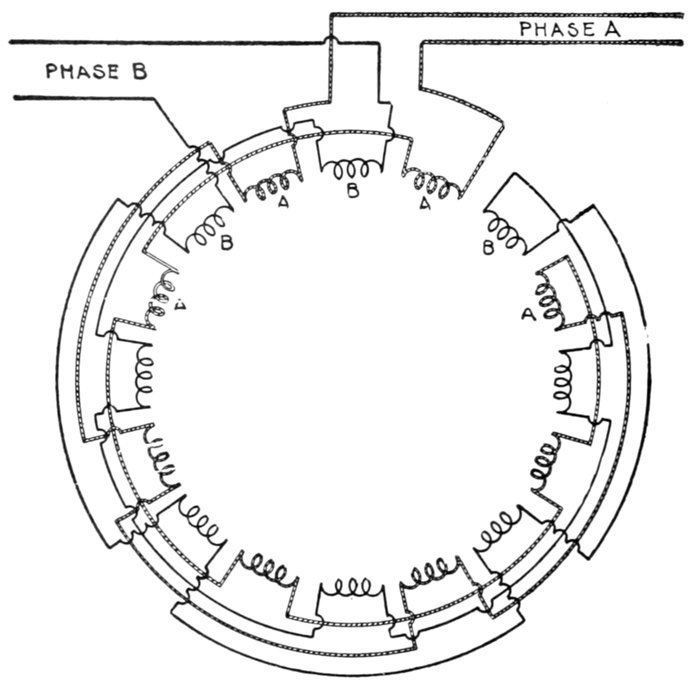 Now if the motor armature be first brought up to a speed corresponding in frequency to that of the alternator before connecting the motor[Pg 1274] in the circuit, the armature will continue revolving at the same frequency as the alternator.
