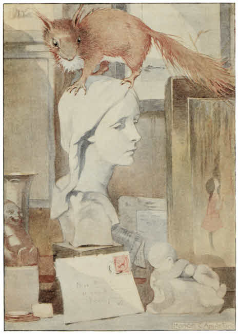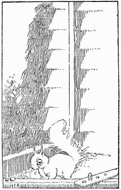 When Miss Appleton kindly undertook to[28] illustrate my first book about the squirrels, though she stayed with us several times in order to sketch Fritz and Bunty from life, it was found necessary for her to have a squirrel model in her friends’ studio in London, where she was working at the time. A wire-netting place was therefore improvised on the roof, outside the high studio window in Kensington, and in due time came a package from Devon and Co. labelled “Live Squirrel.”