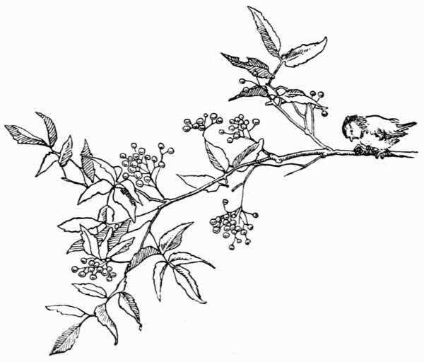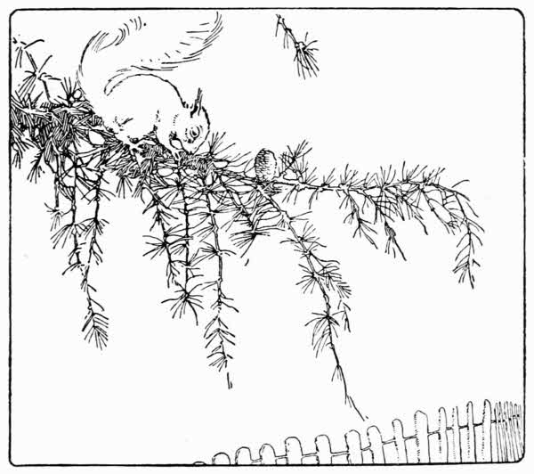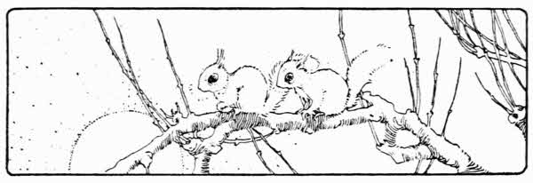 Mr. and Mrs. Laurence Housman are rarely seen. Fritz, as the first-comer, has stood his ground and chased them far. Occasionally in bitter weather, or in early spring (when food is most scarce), they will furtively creep back to the old squirrel-house—the door of which is always open—to steal the secreted nuts of[13] the Fritz family. And, as proof of their domestic felicity, comes sometimes a mysterious and beautiful young black-tailed squirrel—a tail orange-tipped, with delicate markings of gray.