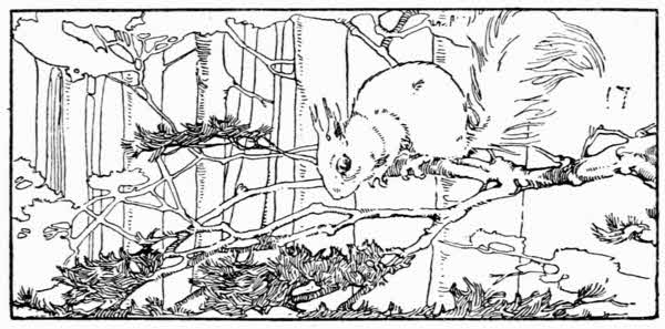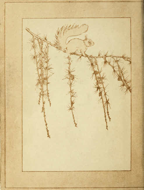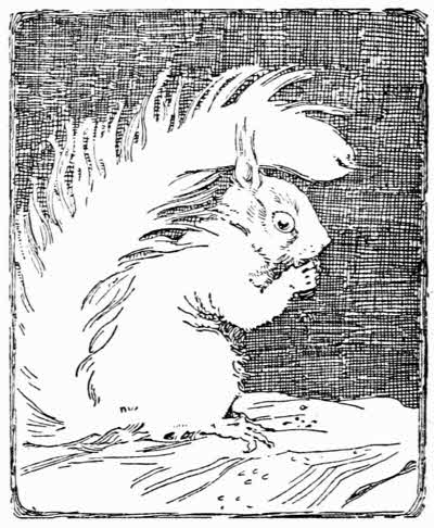 It was very interesting and amusing to watch Ruby as she became more and more used to seeing me about. I would open the casement into the squirrel cage, and go back to bed and watch. This cage was built on to the wall outside my window; it was five or six feet high, and about three feet broad, with a good wooden floor, and what made it delightfully home-like for squirrels was that an evergreen shrub grew inside against the wall right up to the eaves. Ruby would clamber down the central pole, which, with perches nailed upon it, made a capital substitute for a tree trunk, and would come peeping round the casement, to look for nuts which would be on a chair, or on the tall clothes-basket near by. Her little pointed ears, with their pretty tufts, would be sharply cocked, her whiskers quivering nervously, and her tail[42] erect but turned back at the tip in the form of a query. Then as I made no sign of movement she would gain confidence, and venture farther in. When she got a nut and sat up to eat it, breaking the shell so cleverly in two halves, and keeping one half in her paws as a little cup, while nibbling it her ears would come close together, and her tail would curl comfortably right over her dainty little head. She was a charming picture as she sat up, showing her snow-white waistcoat, holding her food between her wee thumbs, her little jaws going like lightning, her brilliant eyes keeping a sharp lookout towards my part of the room—ready to vanish in a second should I dare to move.