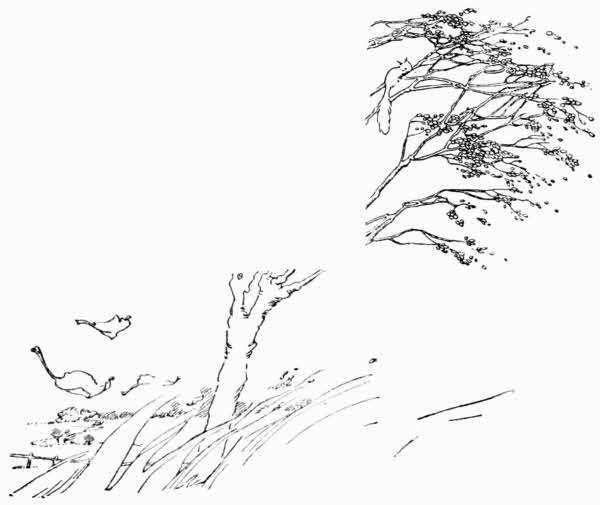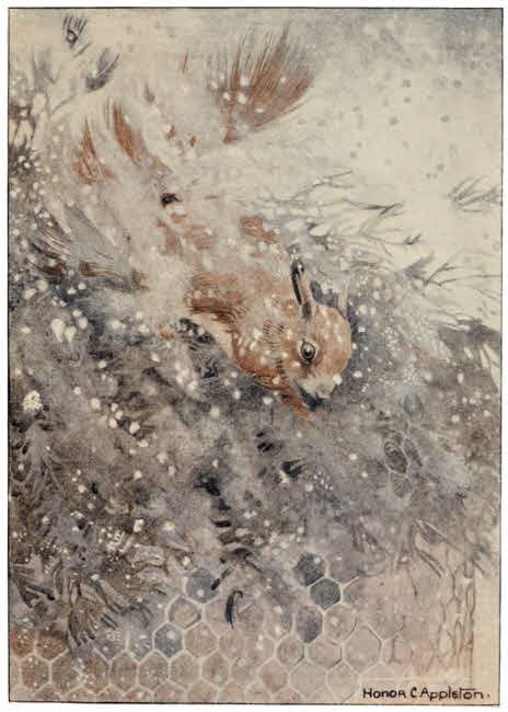Squirrels hate a high wind. The noise in the trees makes it difficult, I suppose, to hear enemies about. Also perhaps they fear to lose their hold of the tossing branches. Be it as it may, I was always certain that in a gale not a glimpse of a squirrel would be obtained all day. Torrents of rain, too, will deter them from scampering about; their tails get bedraggled and heavy and upset their balance.[24] I have known Fritz come in the rain, but it generally meant that the weather was going to clear. I have seen him out in a wild snow squall. He spent a quarter of an hour once on the roof of the garden squirrel-house trying to scratch his way in through the heather thatch where a rival lived, while the snow was falling so thickly I could scarcely see him.