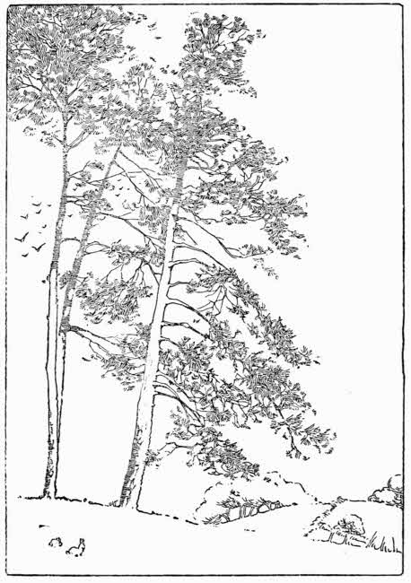 It has always been a mystery to me how he contrived to get to these plantations across the heath without being seen. To reach them he had to cross two wide public roads bristling with motor cars, bicycles, errand boys, and dogs. Besides crossing these dangerous zones,[20] he must (unless he went a circuitous route by fir trees, quite a mile round) have traversed an open gorsy heath. Had he his little runs, I wondered, as rabbits have? And how dangerous, with watchful cats and lynx-eyed terriers about! As long as he could keep to the trees he was safe from the latter, but there was no consecutive belt of trees from our place to those I have mentioned. That he arrived there, there was no doubt, for I sometimes found him there myself, and he would come running down the pine trees at my call. Neighbours told me of his fugitive appearances in their gardens: “A large, red squirrel, very strong and active.”