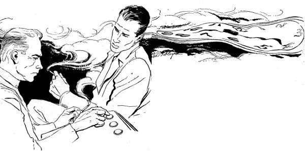 Then the machine stops—at least, the field around us cuts off. You feel a dankish sort of air replace the stale air, and you breathe easier, though we're in complete darkness, except for the weak light in the machine, which always burns, and a few feet of rough dirty cement floor around. You take another cigaret from me and you get out of the machine, just as I do.