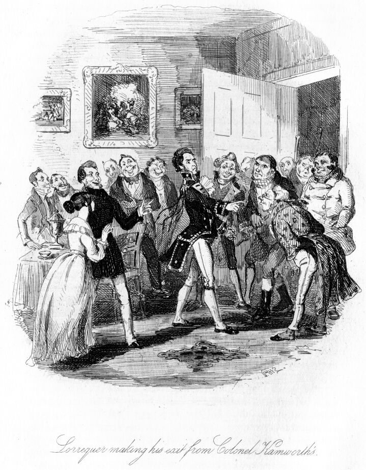 It was a cold raw evening in February as I sat in the coffee-room of the Old Plough in Cheltenham, "Lucullus c. Lucullo"—no companion save my half-finished decanter of port. I had drawn my chair to the corner of the ample fire-place, and in a half dreamy state was reviewing the incidents of my early life, and like most men who, however young, have still to lament talents misapplied, opportunities neglected, profitless labour, and disastrous idleness. The dreary aspect of the large and ill-lighted room—the close-curtained boxes—the unsocial look of every thing and body about suited the habit of my soul, and I was on the verge of becoming excessively sentimental—the unbroken silence, where several people were present, had also its effect upon me, and I felt oppressed and dejected. So sat I for an hour; the clock over the mantel ticked sharply on—the old man in the brown surtout had turned in his chair, and now snored louder—the gentleman who read the Times had got the Chronicle, and I thought I saw him nodding over the advertisements. The father who, with a raw son of about nineteen, had dined at six, sat still and motionless opposite his offspring, and only breaking the silence around by the grating of the decanter as he posted it across the table. The only thing denoting active existence was a little, shrivelled man, who, with spectacles on his forehead, and hotel slippers on his feet, rapidly walked up and down, occasionally stopping at his table to sip a little weak-looking negus, which was his moderate potation for two hours. I have been particular in chronicling these few and apparently trivial circumstances, for by what mere trifles are our greatest and most important movements induced—had the near wheeler of the Umpire been only safe on his fore legs, and while I write this I might—but let me continue. The gloom and melancholy which beset me, momentarily increased. But three months before, and my prospects presented every thing that was fairest and brightest—now all the future was dark and dismal. Then my best friends could scarcely avoid envy at my fortune—now my reverses might almost excite compassion even in an enemy. It was singular enough, and I should not like to acknowledge it, were not these Confessions in their very nature intended to disclose the very penetralia of my heart; but singular it certainly was—and so I have always felt it since, when reflecting on it—that although much and warmly attached to Lady Jane Callonby, and feeling most acutely what I must call her abandonment of me, yet, the most constantly recurring idea of my mind on the subject was, what will the mess say—what will they think at head-quarters?—the raillery, the jesting, the half-concealed allusion, the tone of assumed compassion, which all awaited me, as each of my comrades took up his line of behaving towards me, was, after all, the most difficult thing to be borne, and I absolutely dreaded to join my regiment, more thoroughly than did ever schoolboy to return to his labour on the expiration of his holidays. I had framed to myself all manner of ways of avoiding this dread event; sometimes I meditated an exchange into an African corps—sometimes to leave the army altogether. However, I turned the affair over in my mind—innumerable difficulties presented themselves, and I was at last reduced to that stand-still point, in which, after continual vacillation, one only waits for the slightest impulse of persuasion from another, to adopt any, no matter what suggestion. In this enviable frame of mind I sat sipping my wine, and watching the clock for that hour at which, with a safe conscience, I might retire to my bed, when the waiter roused me by demanding if my name was Mr. Lorrequer, for that a gentleman having seen my card in the bar, had been making inquiry for the owner of it all through the hotel.