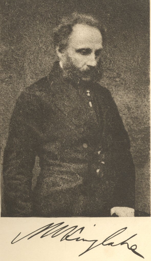 It is just eleven years since Kinglake passed away, and his life has not yet been separately memorialized.  A few years more, and the personal side of him would be irrecoverable, though by personality, no less than by authorship, he made his contemporary mark.  When a tomb has been closed for centuries, the effaced lineaments of its tenant can be re-coloured only by the idealizing hand of genius, as Scott drew Claverhouse, and Carlyle drew Cromwell.  But, to the biographer of the lately dead, men have a right to say, as Saul said to the Witch of Endor, “Call up Samuel!”  In your study of a life so recent as Kinglake’s, give us, if you choose, some critical synopsis of his monumental writings, some salvage from his ephemeral and scattered papers; trace so much of his youthful training as shaped the development of his character; depict, with wise restraint, his political and public life: but also, and above all, re-clothe him “in his habit as he lived,” as friends and p. viassociates knew him; recover his traits of voice and manner, his conversational wit or wisdom, epigram or paradox, his explosions of sarcasm and his eccentricities of reserve, his words of winningness and acts of kindness: and, since one half of his life was social, introduce us to the companions who shared his lighter hour and evoked his finer fancies; take us to the Athenæum “Corner,” or to Holland House, and flash on us at least a glimpse of the brilliant men and women who formed the setting to his sparkle; “dic in amicitiam coeant et foedera jungant.”