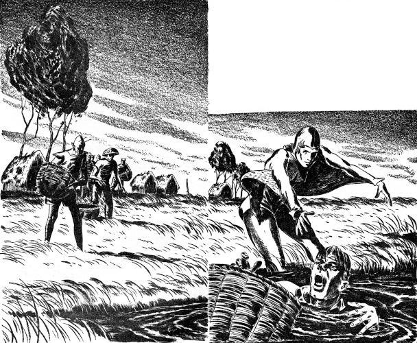 At least a dozen men were moving near him, waist deep in the Venusian mud. At his cry, they stopped and stared at him dully, fatalistically. They could easily have formed a chain and pulled him out, but none moved. They'd seen too many repetitions of this tragedy to care anymore. It happened every day; a new man, a little careless, caught in one of the deadly sink holes ... it happened even to the veterans of this Venusian prison camp, sometimes deliberately, as they became weary of a hopeless existence.
