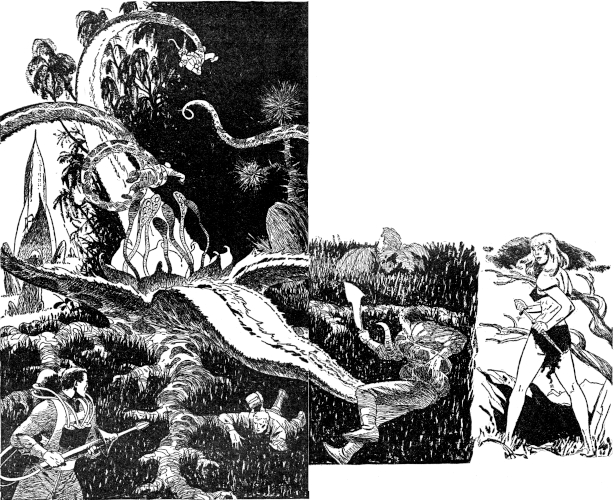 Yet, within five minutes, he was reporting back to the ship that the party was intact. The giant hydra-type plant, in its death throe, had flung only him. The others had been held adangle in mid-air while it chose to feed on Pritchard first and, although he had been sent sailing, the tentacles gripping the others had simply loosened. One man, dropped upside down from ten feet, had a fractured collarbone, but they were even now cementing a flexicast in place and he would continue with the rest. Majinski had had the flamer torn from his hand and they weren't able to find it.