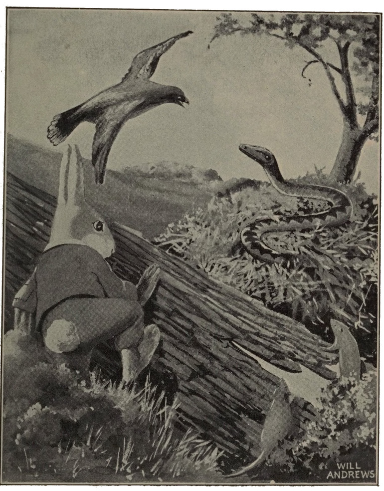Bobby was squawking loudly enough, only he wasn’t waiting to be eaten. He was taking very good care not to be. But he was coming so close to it that Nibble almost forgot everything else in watching him. There was one thing he did remember, though, and that was that the wicked snake had nearly caught him by sneaking up from behind. So he took proper rabbit care that no one should do that again. He found a nice log where he could see what was going on, but he didn’t hop straight up on it. He took three short little leaps past it, and one great big bound back to his perch. Since he still had on his little mud boots which had hidden his trail from Glider out in the Broad Field, he felt pretty safe. And when he crouched down like a small brown knot on the log no one seemed to notice him.