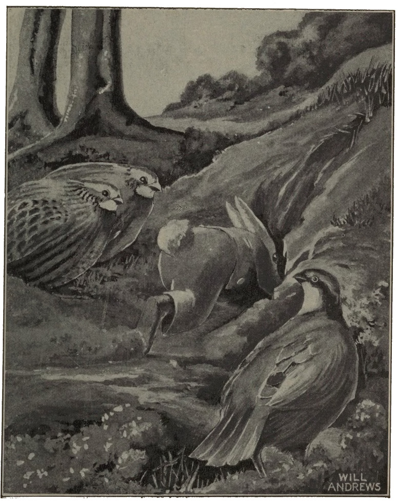 So they showed him the little bit of a hole where they had tried it themselves and he settled his strong hindfeet and moved the little clawed spades of his forepaws so fast they fairly twinkled. When he found a root he used his chisel teeth. As soon as he gnawed it through his paws would begin to fly again. And the quail crowded around and whispered to each other. Presently they began to croon a sort of song. “He’s coming, coming, coming soon.” And the little quail deep in the bank would answer.