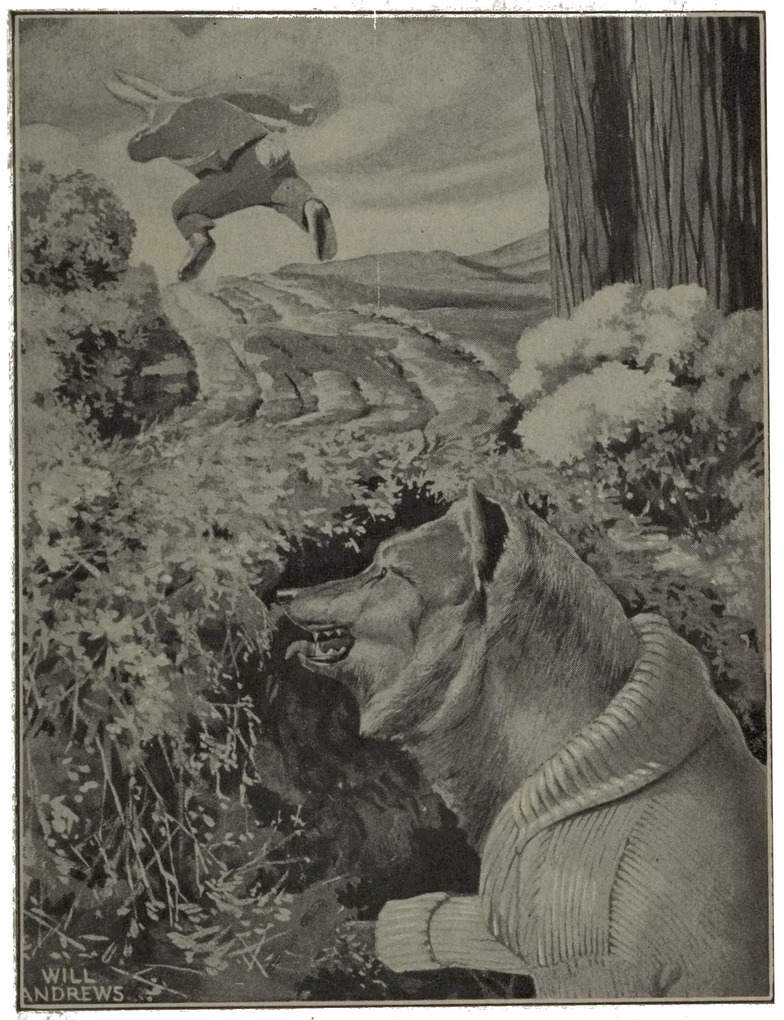 Nibble’s feet just bounced of themselves, and Bobby’s wings beat, and Glider’s ugly head landed right between them. For Glider hears everything that goes on along the ground. He had heard Nibble stamping to call his mother. If Mammy Rabbit had answered Glider would never have come. But she didn’t—so Glider did. And now lonely little Nibble Rabbit was racing off and Glider was after him, simply boiling over with rage, as fast as he could put tail to the ground. He didn’t think Nibble could run so very far. He was sure he would catch him.