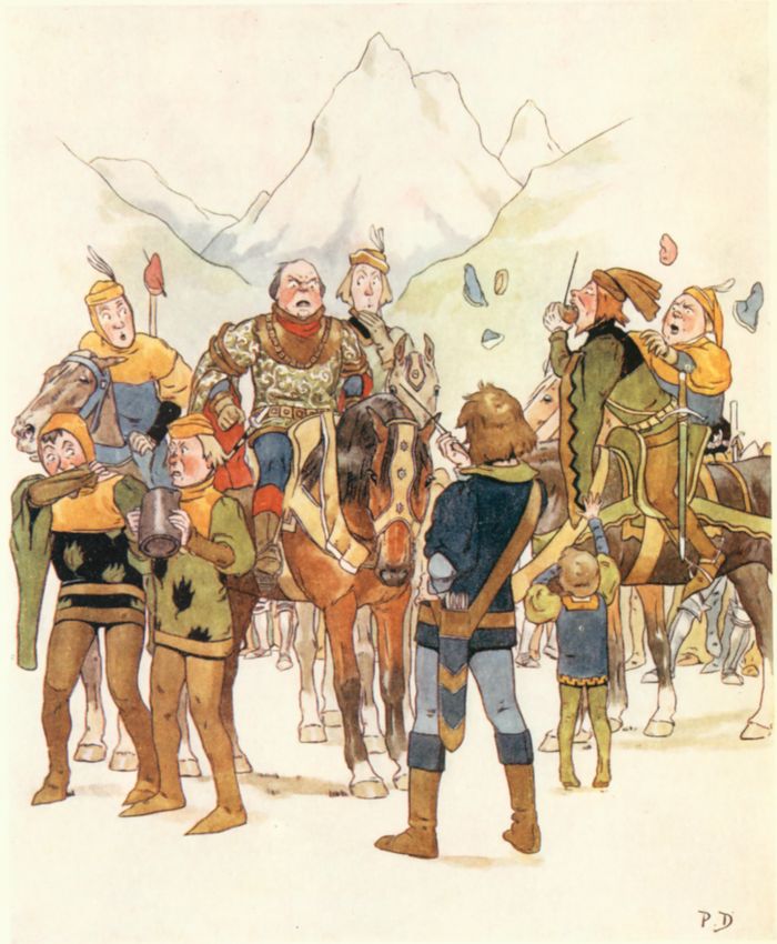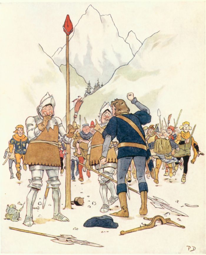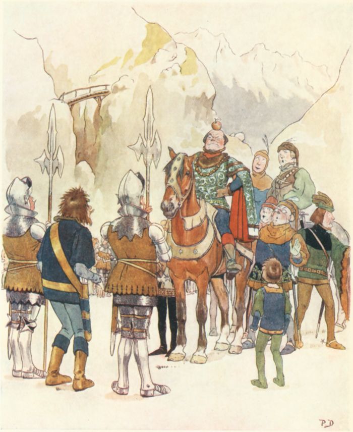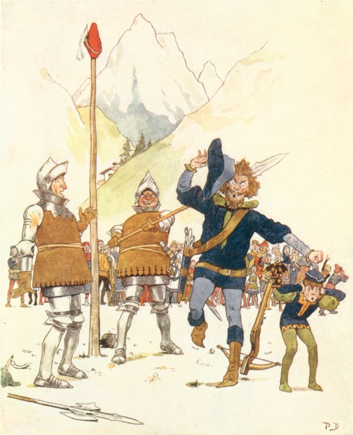 One of the first things the Emperor did was to send his friend Hermann Gessler to govern the country. Gessler was not a nice man, and it soon became plain that he would never make himself really popular with the Swiss. The point on which they disagreed in particular was the question of taxes. The Swiss, who were a simple and thrifty people, objected to paying taxes of any sort. They said they wanted to spend their money on all kinds of other things. Gessler, on the other hand, wished to put a tax on everything, and, being Governor, he did it. He made everyone who owned a flock of sheep pay a certain sum of money to him; and if the farmer sold his sheep and bought cows, he had to pay rather more money to Gessler for the cows than he had paid for the sheep. Gessler also taxed bread, and biscuits, and jam, and buns, and lemonade, and, in fact, everything he could think of, till the people of Switzerland determined to complain. They appointed Walter Fürst, who had red hair and looked fierce; Werner Stauffacher, who had gray hair and was always wondering how he ought to pronounce his name; and Arnold of Melchthal, who had light-yellow hair and was supposed to know a great deal about the law, to make the complaint. They called on the Governor one lovely morning in April, and were shown into the Hall of Audience.