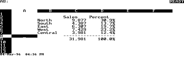 Now we'll construct a simple spreadsheet to demonstrate some absolute and relative cell referencing concepts. First create a new spreadsheet by pressing (MENU) Worksheet Erase Yes. Have it display values in the comma format by pressing (MENU) Worksheet Global Format , (comma) 0 (ENTER). In cells B3 through B7 enter North, South, East, West and Central. In cell C2 enter Sales and in cell D2 enter Percent. Fill in the numbers in C3 through C7 as follows:
