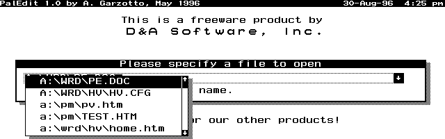 PalEdit opening screen displaying a "pick-list" that lets you select the document you want to load.