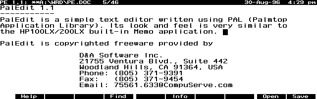 PalEdit was developed by Andreas Garzotto, who has previously given HP Palmtop users his HV (Hypertext Viewer) program. Andreas is the author of WWW/LX, reviewed on page 12. HV and PalEdit are components of WWW/LX.