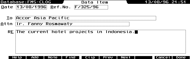 Then open your modified Phone Book, highlight the name you want to send a fax to and start your macro. After running, the macro ends in the archive database (FMS-CLOG.GDB) with the cursor in the field named RE. Fill in what the fax is regarding and press (F10) to save the new entry.