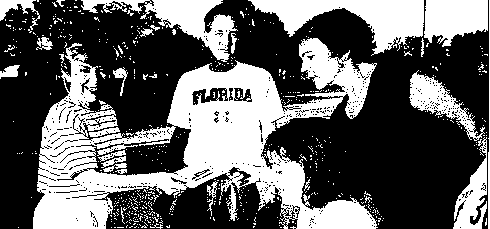 Louise keeps Senior Games Racewalk scores by the roadside on her HP Palmtop using Alpha Four. Shown in the picture above are the race officials from the Florida Walkers Club. Standing from left to right are Mary King, David Stein and Bonnie Altenhein.