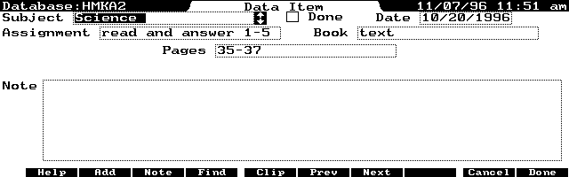 Data Item screen of my custom Homework Database lets me track assignments, subjects, and date assigned.