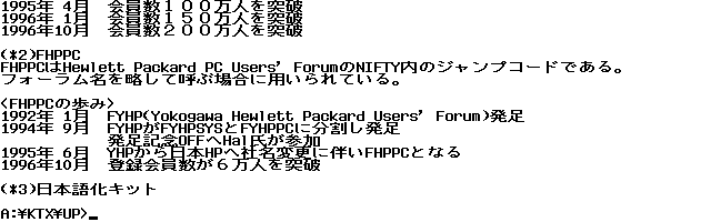 It is impossible to start any article about the use of the HP Palmtop in Japan without first mentioning the FHPPC forum on NIFTY-Serve. NIFTY-Serve is the Japanese counterpart of CompuServe, started in 1986. NIFTY-Serve, the largest commercial information service in Japan, has a large number of forums. FHPPC is one of them and has always dealt with the LX series of HP Palmtop computers.
