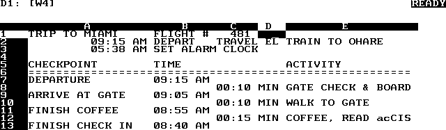 Go to cell A9 and type ARRIVE GATE. Continue describing the "activity" in the even rows of column E, the amount of time each takes in column C, and the milestone where you should be in column A. As you make adjustments to the time for tasks in column C, the milestones in column B will all change accordingly. You can zero out an entry by typing @TIME (0,0,0) if the entry is just a reminder to lock the door or deposit a letter in a mailbox, or something else that doesn't require any time.