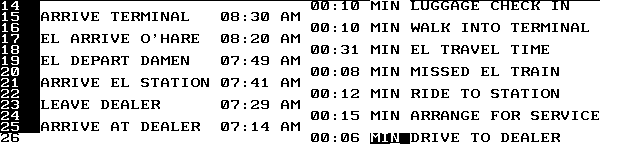 Consider my example spreadsheet (see Screen 1). The process starts with the morning alarm clock (cell B43) and reads from bottom up, ending with the aircraft departure (cell A2). You can see that I have 31 minutes for the public train ride to the airport (cell C18). That is the time it takes from my train stop to O'Hare Airport. I also allocated eight minutes for a missed train. This is in case I arrive at the station just as a train goes through, as the trains are eight minutes apart. These amounts can be adjusted for different times of day.