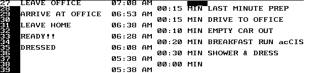 Flights change at the last minute, and other circumstances enter in that affect what time to set the alarm clock for a morning departure (or to return home to begin the process of an afternoon or evening departure) so I left plenty of room for modification in the spreadsheet. Lotus and Hewlett-Packard's palmtop do the calculating and keep me fully informed about whether I have time to dawdle with coffee and talk on the phone, or whether I should pick up the pace a bit.