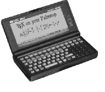 The TeX I use on my Palmtop is SBTeX, which is available as SB40TEX.ZIP at various sites on the Internet for free DOS software. I use DVIOUT as the TeX viewer. The version of DVIOUT I use has been modified for the HP Palmtop and needs EMS. In my case the main system is Japanese which automatically enables EMS, otherwise the system would not work. This TeX viewer may be found by searching for T24202HP. LZH. However, these files are not enough; you also need font files. I gathered those CM fonts and corresponding TFMs from various sites which I cannot remember well. I now have a complete set of fonts and metrics covering those designed by Donald Knuth and the American Mathematical Society. I usually prepare my TeX files in the "Plane TeX" format. (I call this "Plane TeX" rather than "plain TeX", to indicate my frequent use of it in a plane over Siberia or Italy, etc.)