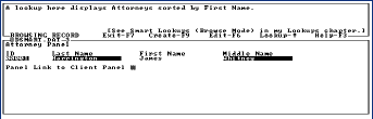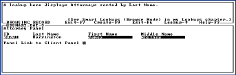 When you use the database, you might look for a particular attorney's name. When you find your Attorney you Tab to the "Panel Link to Client Panel" and then hit Down Arrow to arrive in the Client Panel to view Clients attached to that Attorney or create new ones.