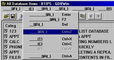 That limitation would ordinarily be enough to make the program worthless for non-Japanese users. However, if you're familiar with the ways in which most Windows programs work, you may be able to figure out some of the capabilities of GDBWin. Otherwise, if you're familiar with the way the function keys work in a Palmtop database application, you can also coax GDBWin into being useful.