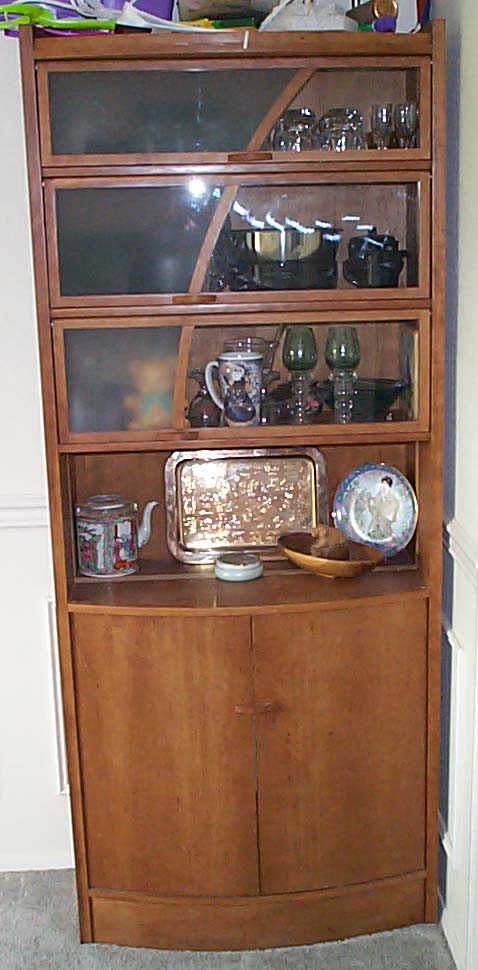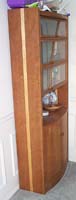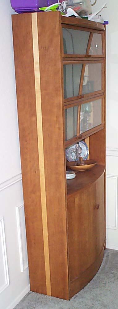 So, furniture studio meant starting on paper and with ideas bantered about. While paper designing, you make scale models with cardboard. Sooner or later, you come to a design you want to build. The next step is a full size mock up with particle board to work out assembly and other design issues. Finally, you go get the REAL wood, and painstakingly build your design and hope for the best. I had a few glitches, such as the widest pieces of cherry were not wide enough for my cabinet sides and shelves. To fix this, I opted for an "accent" in the maple strip you see running through center of the sides and shelves. I also had a big SNAFU when during final assembly (lots of glue and tight joints which do NOT come apart after you get them together) I noticed that I had put the main shelf (the one on the TOP of the cabinet doors below) UPSIDE DOWN! The shelf was pre-drilled for the hinge pins of the doors! DOH! So, after crying and soul searching, I ended up doing another "accent" of maple to fill those holes, and drill through for the new holes. Anyway, it all came together, and I applied a (half-assed) french laquer finish. Unfortunately, while transporting from studio to home, it got rained on, giving me a water spotted half-assed french laquer finish. ;-)