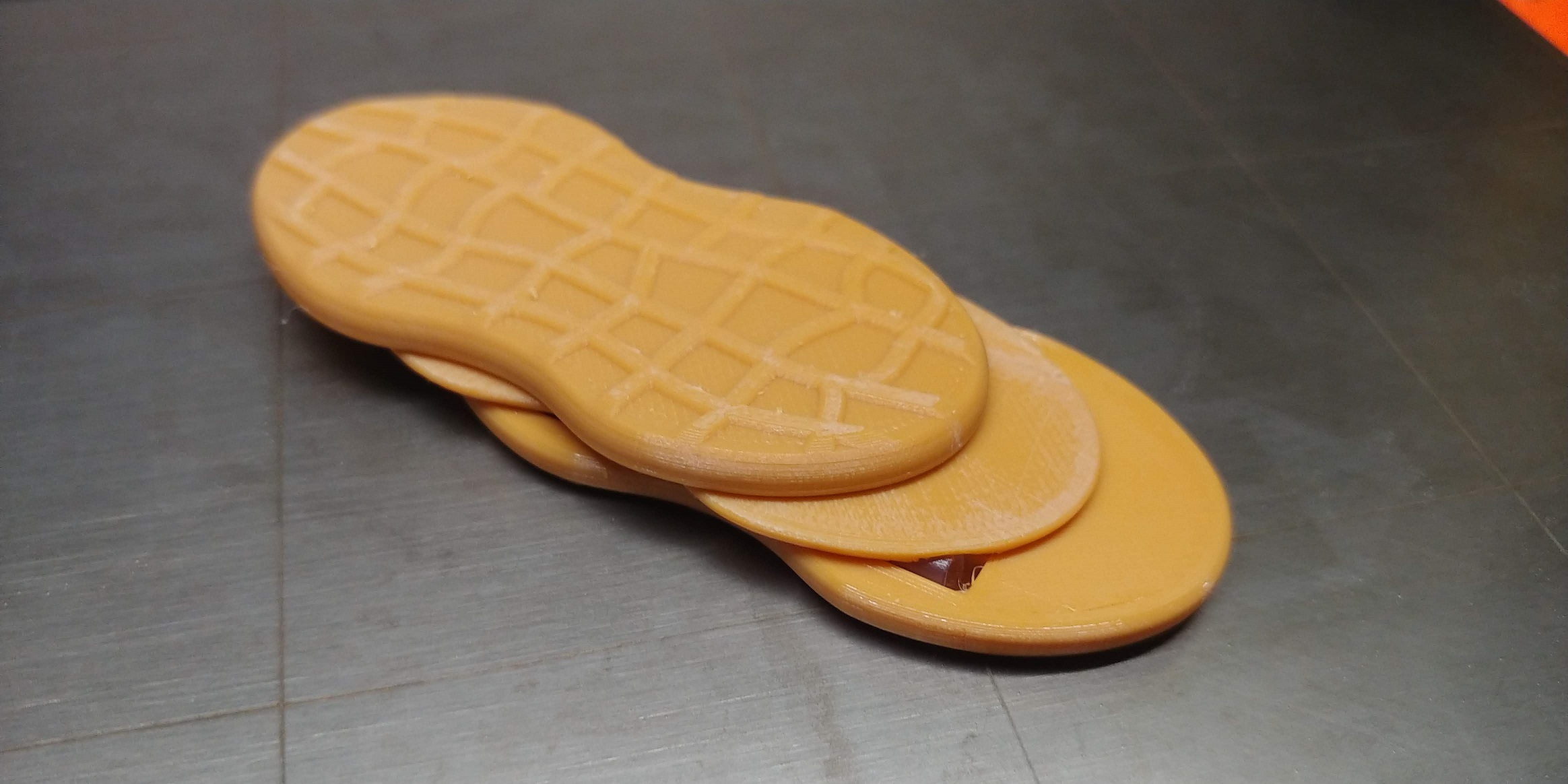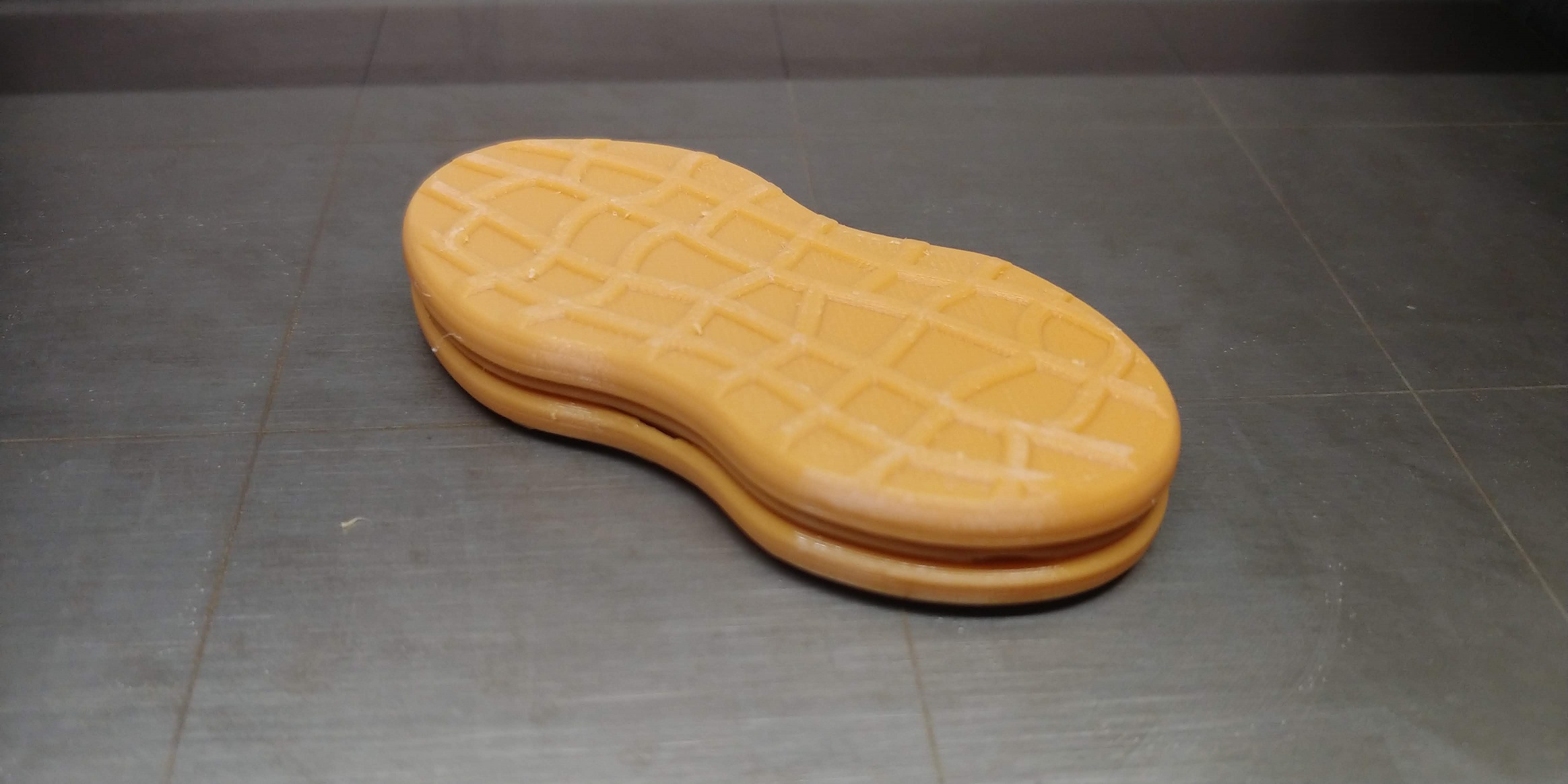 The Nutter Butter haptic slider was designed by me from the ground up using an actual Nutter Butter cookie for reference. The size, shape, and pattern is the same as a real Nutter Butter cookie. This slider uses teflon rails for smooth sliding, as well as 4mm ball bearings to limit motion and prevent accidental separation of the part, which are held together and made haptic with 8x1mm round magnets. There are four such magnets in each piece, including the filling, for a total of twelve magnets. If desired, the rails and balls can be removed to free up the motion for additional skill-play fidgeting. They can easily be replaced by hand as well. These are printed in PLA, and the magnets are trapped inside the printed parts. While the color shown may not be a perfect match to the real cookie, I think it's a nice fit. However, the color may change if a better match is found in the future.
