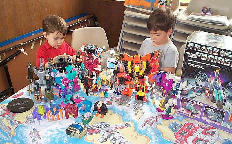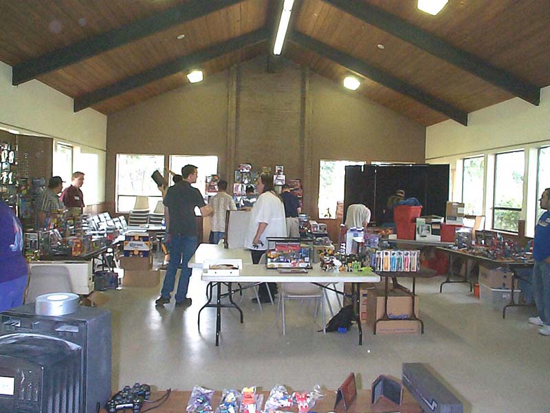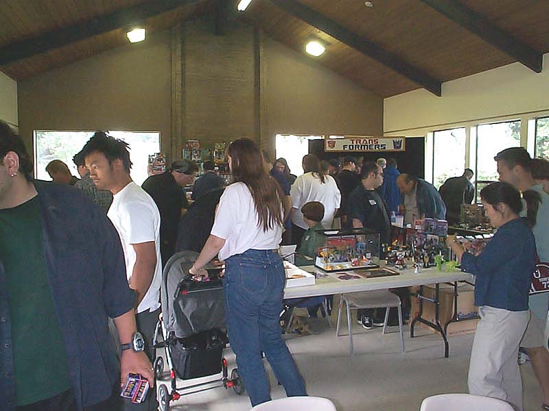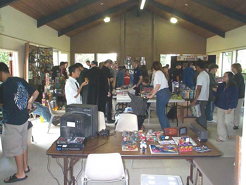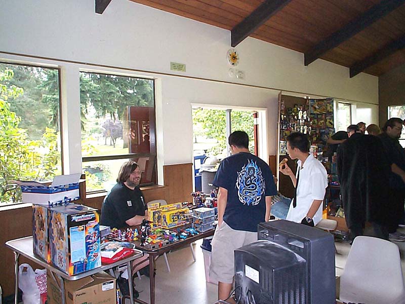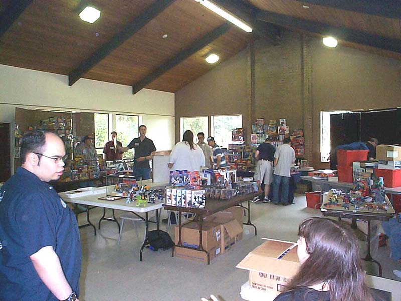 Well, the day has come and gone. Reports have been written, and the cat has forgotten what the inside of the bag even looks like. But hey, I took pictures, and I took video (with Richard's generous assistance), so I figure I might as well tell my story, if only to toss in one more perspective, as an organizer, attendee, and oft-times ringmaster. For my part, aside from being the numb-skull that said "Hey, how's about everyone in the area come hang out with me for a day?" 5 years ago, I contributed where I could. Starting with the reservation of the building 6 months ago, through all the "Yeah! let's do that!" replies to Richard's communications with crazysteve about the exclusive toys, the endless requests for Richard to tweak this and that on every inch of every panel of the box designs to suit my perfectionist artistic eye, which he begrudgingly yet skillfully made happen with his Photoshop magic, the over 50 photo-quality prints my printer churned out for me to carefully (perfectionist, remember?) trim out, fold up, and encase 45 toys in, my work truly encompassed only a small portion of it all. Zobovor has detailed his beautiful work on the character art, battle scene, and instruction booklet. Crazysteve has detailed his mind-boggling work on the breathtaking custom Bumblebee toy. Richard has glossed over the work he did on the box design somewhat... when I said endless requests for tweaking the design, I wasn't kidding... he probably won't do a box with my knowledge again. ;-) All that work came seamlessly together to be one of the most memorable Transformers conventions for all that attended, and possibly the best CybCon for a very long time to come. So what was it like on the day of? Well, I can only tell my side, so here we go. Who can sleep well the night before a big meeting they're hosting? Well, not me anyway. I packed most everything the night before so that I wouldn't need to get up too early. Even though I set an early alarm to make sure I was ready to go and there on time, I was wide awake hours before my alarm was set to go off. I figure I might as well get up and get ready, if only so I wasn't feeling like I was in a rush. I had planned to be there at 8:30, half an hour before the dealers were to begin setting up, but even with stopping for doughnuts and bags of ice, I was there at about 8:15. Not at all surprisingly, there were already a few people there. If my feeble memory doesn't fail me, there were about 6 people there, 2 or 3 were dealers. I opened the building and took a quick look around to form a plan of action. It didn't take long for more people to show up, dealers and attendees alike. I put up an "arrival order" sheet for people to sign when they arrive, rather than making people (including dealers) stand in line the entire time. The early dealers helped me set up the (fortunately) numerous included tables into an island and tables around the perimeter for the other dealers to occupy. Fortunately, we didn't need many more tables, and the empty spots there were were promptly filled. Every dealer had a spot, and we even had a small area left over (more on that later). With all the tables in place, dealers could pick their spot and start setting up. Richard and his lovely wife, Zeatha, who was an indispensible helper for the entire time, arrived shortly after and helped with setting things up and bringing things in. Joebot arrived a little late this year due to an unfortunate fight with food poisoning, so several of us helped him bring his stuff into the room so he could set up a little faster. Richard set up a table with my old 10 gallon fish tank turned over on top of a tiered shelf showing off past CybCon toys, this years toys and prototypes, as well as some other rare and delicate items, including my BotCon 2004 breakfast exclusive Breakdown. He also set out some of his newer TFs like Shockblast, Cliffjumper, Binaltech Hound, and test-shot Towline. I set up my tables blocking off the kitchen area and put on them my TV and PS2 for video games (starting with the PS2 Transformers game for people to play with), the raffle and auction items, and the sign up sheets for the Trivia and Beast Wars Transmetals game tournament. This was also the ill chosen setup for delivering pizza to hungry people at lunch time.... but I'll talk about that later. :\ Shortly before 10am I announced to the dealers that they needed to go get in line if they wanted an exclusive. The sign in sheet had done its work, and the dealers were able to take their place according to their arrival time. I made sure everyone was lined up, and that anyone who didn't register was waiting at the end of the line. Such is their punishment! hehe. Anyway, I opened the doors promptly at 10, and Zeatha was immediately put to work. To speed things up, and because I was an idiot who forgot to get change for the people who inevitably had only 20s and 50s so people ended up buying a ton of raffle tickets (price reduced to 2 tickets for a dollar!), Richard came over to help her pass out the toys as they were sold, and to count off raffle tickets. Fortunately, another dealer has a few bucks in change to help us along, but I think most people decided to go ahead and get their "change" in raffle tickets anyway. I kept an eye on Joebot's table, which was still being set up, as he was in line for a little longer than the other dealers. It didn't take long for things to be in full swing, with the building, effectively the dealer room, being full of busy collectors looking for their next deal. It was also not long before everyone waiting outside came in and decided to buy toys or not. What surprised me was that there were actually TWO Bumblebee toys left over! I took the opportunity to do what we had originally planned to snag them for auction and raffle. As I approached Zeatha at the sign-in table, someone came up to buy one of them, so I only got one, and decided to put it with the Auction items. 11am rolled around, 