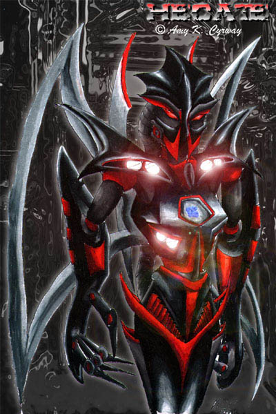 - "Hecate" - a rather mean Vehicon who takes over for Tankorr's tank drones. She's a hovertank/muscle car...and she's evil to her corrupted spark. Prismacolor; Photoshop-rendered background, 73k