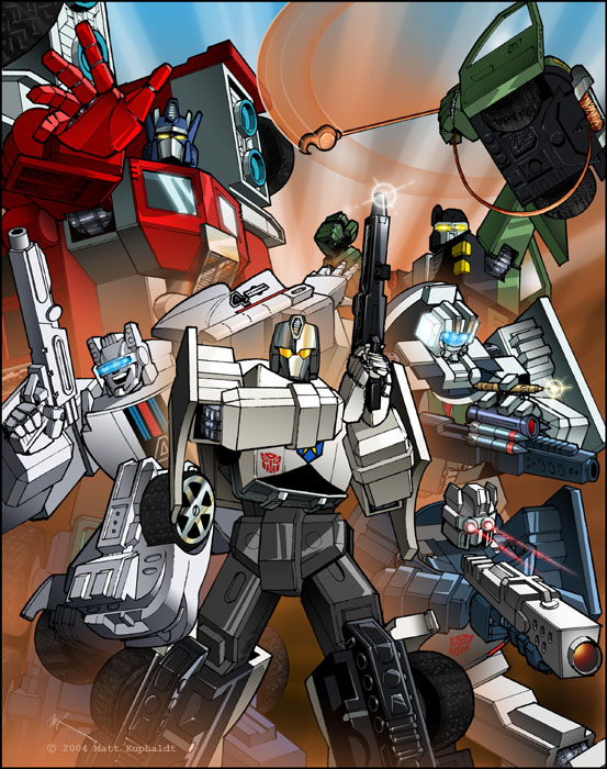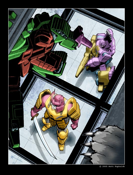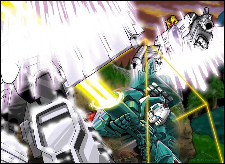 7. "NeoG1 Spychangers: Coming Up Short" - Inspired by the release of several recolored Robots In Disguise Spychanger toys as G1 characters, this picture tied for first place in the 2D-color category at the OTFCC 2004 art contest. (164k, 1-15-08)