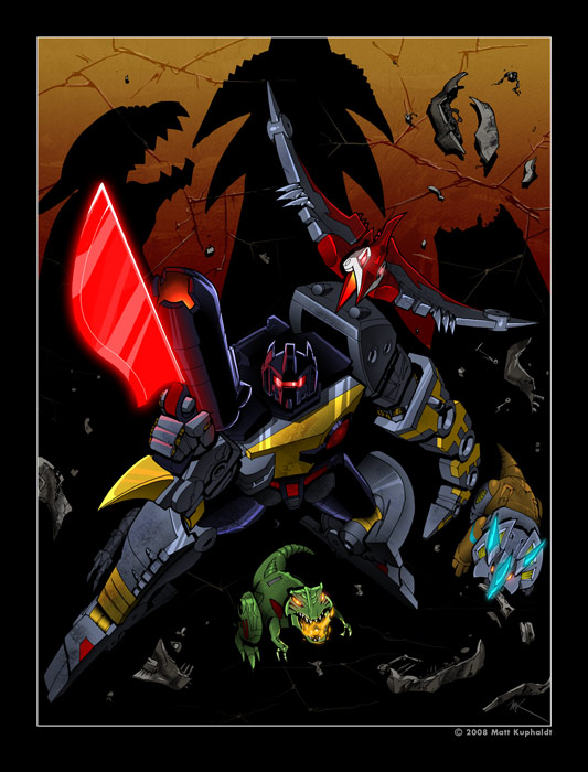 1. "Dinobots vs. Trypticon: First Strike" - Trypticon's Classics toy is absolutely tiny, but this picture restores him to enormity. The Dinobot Mini-Cons, though, can't be helped. Not that they probably care. (90k, 1-15-08)