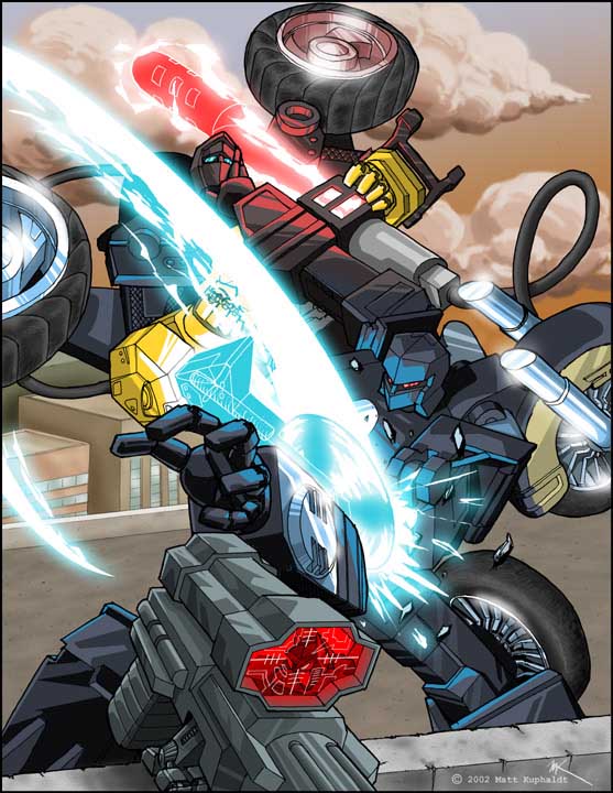 17. "Sideways vs. Axer: Vicious Cycles" - Sideways the Autobot and Axer the Decepticon were released as Robots In Disguise toys, but they never appeared in the (rather goofy) cartoon. So perhaps while the camera was on the zany antics of the main characters, this kind of stuff was happening just offscreen. (88k, 8-7-02)