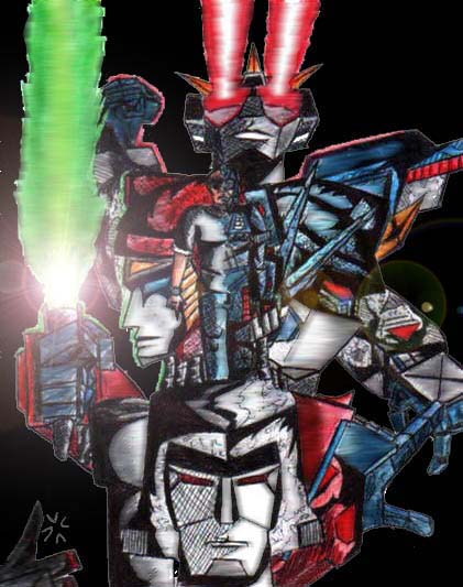 - Megaplex - This is a pencil drawing (of my own creation) that I inked and colored with color pencils. I then scanned it and edited in photoshop. Megaplex is the main focus of the pic. Megaples is a gestalt comprised of Megatron, Galvatron, and Shadowplex (in my fan fic universe), and to the right is Bloodscream, Megaplex's right hand 'bot. (30k, 1-1-01)