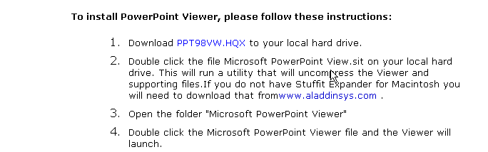 Summary: Downloading Microsoft PowerPoint Viewer for the Macintosh from a PC. Installing it on a Macintosh (HFS) medium from a PC.