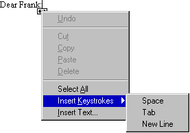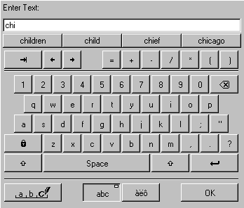 The "writing tool" (see Figure 4) is also new for Windows 95. Tapping the "writing tool" button (automatically provided for any edit box) brings up a comfortably sized writing area or an on-screen keyboard, both with correction tools. The on-screen keyboard has a new layout and new features such as word completion, in addition to providing a familiar interface for entering characters. The keyboard is accessible from both the "writing tool" button and as a stand-alone application, enabling the use of the pen to control MS-DOS-based programs. Gestures Pen Services for Windows 95 makes much better use of gestures. Gestures are handwritten symbols that are recognized as actions rather than as text. Like keyboard shortcuts for menu commands, gestures make great accelerators. However, just as an application that only provided keyboard shortcuts without menus would be very difficult to learn and use, a system that relied only on gestures would be similarly difficult, especially since gestures can be mis-recognized. For this reason, all commands that are available as gestures are also available either as buttons in the "writing tool" button or as commands on an action handle menu. Just as many users can use Windows without ever using a keyboard shortcut for a menu command, so too can pen users be productive without ever having to learn a gesture.