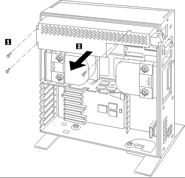 Remove 8580 PSU Power off and unplug the system! Remove rear drive carrier from DASD support structure. Unplug any four pin drive power cables. Unplug the planar power plug. Remove the three screws that hold the PSU in. Pull PSU out.