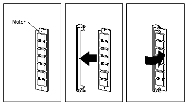 3.  Touch any unpainted metal surface on the server.  This equalizes the voltage potential between you and the system. Remove the SIMM from anti-stat package (if applicable) and place it into the SIMM socket WITH THE NOTCH UP. Push the SIMM in and slowly rotate it to the right untill it snaps into place.