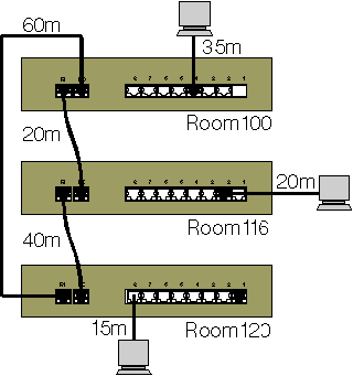 (sum of MPR cables - shortest MPR cable) + LLL should be <= 145m (478 feet) for 4 Mbps - or -should be <= 290 meter (957 feet) for 16 Mbps MPR = Main Ring Path LLL = Longest Lobe Length If the ring has e.g. three 8226s connected with cables of 40 m (132 ft), 60 m, (165 ft) and 80 m (264 ft) with a longest lobe length of 50 m (165 ft), distance of 95 m (313 ft), it falls within the guidlines. However, if these distances where all doubled, the transmission distance would be 190 m (627 ft), clearly in violation of the maximum distance guidlines. |
