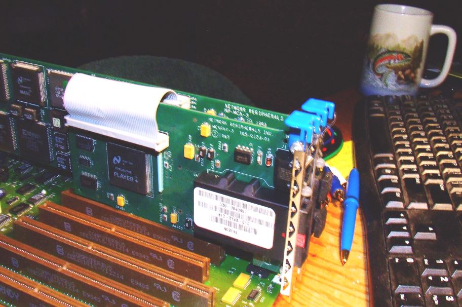 JP4 header has rightmost pin snipped. JP5 header has lower left pin snipped. JP6 is only the holes for a row of pins. U21 NS DP83257VF Player + U41 610-0166-01D Transceiver The DAS side card's cables will only fit in the base card if the side card is to the right of the base card. It was easier to put the cables on before trying to put the adapters in the MCA slots because you can have both cards "flat". For us with NP-MCA-3 cards that were banged about some, check the (exposed!) pin header on the base card. Some of the pins may have been bent some, and trying to install the cable will be frustrating. ![]() Gereon Wenzel: Looks like its time to start my work on a FDDI Howto/FAQ? No need someone else already did... Google is your friend! http://www2.rad.com/networks/1995/fddi/fddi.htm http://www.cicese.mx/~aarmenta/frames/redes/fddi/FDDIFAQ.html http://www.cisco.com/univercd/cc/td/doc/cisintwk/ito_doc/fddi.htm > Does anyone have a manual for this card? Not sure if this one matches your cards? http://www.enterasys.com/support/manuals/hardware/0826_01.pdf David Ress IIRC, Win95 has built in support. NT 4.0 has built in support (and auto-detects it, unlike the SK-Net FDDI adapter). Uses Npmca.sys for the driver. I tried a while ago to find the diagnostic program for the adapter and failed. Anyone? NP has since been bought out, and the new company has extremely limited support for NP hardware, mostly switch related. Nothing microchannel. Still, for FDDI networks, it is my preferred adapter. Support for Multi Channel Architecture The BSI-2 device provides three Input Channels and two Output Channels, which are designed to operate independently and concurrently. They are separately configured by the user to manage the reception or transmission of a particular ADF Sections @0069h Network Peripherals FDDI Adapter Map 512 I/O Address Range This selects the 512 I/O address space of the adapter <"5400h thru 55FFh">, 5C00 - 5DFF, 5E00 - 5FFF, 7400 - 75FF, 7600 - 77FF, 7C00 - 7DFF, 7E00 - 7FFF, D400 - D5FF, D600 - D7FF, DC00 - DDFF, DE00 - DFFF, F400 - F5FF, F600 - F7FF, FC00 - FDFF, FE00 - FFFF Modes and Interrupt Level WARNING : DATA STREAMING MODE should be selected ONLY if you are sure that this machine supports data streaming. This will result in better performance. SLOW MODE should be selected if this FDDI adapter is installed in an older Model 80 that has not had the IBM EC applied. (Ed. I think this refers to the non-busmaster capable planars) <"Normal Mode & Interrupt 3">, Normal/Int5, Normal/Int10, Normal/Int15, Data Streaming Mode & Interrupt 3, Data Streaming/Int5, Data Streaming/Int10, Data Streaming/Int15, Slow Mode & Interrupt 3, Slow/Int5, Slow/Int10, Slow/Int15 Arbitration Level Using arbitration levels, this adapter accesses memory directly without burdening the computer's main microprocessor. An arbitration level of 0 has the highest priority, and increasing levels have corresponding decreased priority. <"Level_1">, 0, 2, 3, 4, 5, 6, 7, 8, 9, 10, 11, 12, 13, 14 Map 8K Memory Address Range This selects the 8K memory space of the adapter <"0C0000h thru 0C1FFFh">, 0C2000 - 0C3FFF, 0C4000 - 0C5FFF, 0C6000 - 0C7FFF, 0C8000 - 0C9FFF, 0CA000 - 0CBFFF, 0CC000 - 0CDFFF, 0CE000 - 0CFFFF, 0D0000 - 0D1FFF, 0D2000 - 0D3FFF, 0D4000 - 0D5FFF, 0D6000 - 0D7FFF, 0D8000 - 0D9FFF, 0DA000 - 0DBFFF, 0DC000 - 0DDFFF, 0DE000 - 0DFFFF, 0E0000 - 0E1FFF, 0E2000 - 0E3FFF, 0E4000 - 0E5FFF, 0E6000 - 0E7FFF, 0E8000 - 0E9FFF, 0EA000 - 0EBFFF, 0EC000 - 0EDFFF, 0EE000 - 0EFFFF |