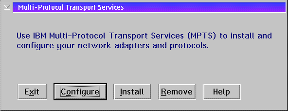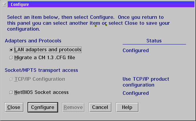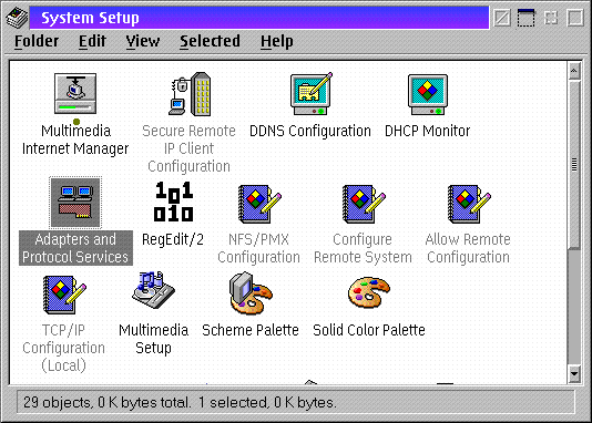 (I found this to be a particularly useful resource, describing the inner workings of and relationships between Warp's networking services and those of Windows NT, Windows95, and Windows 3.1 - lots of practical information about these systems, as well as Banyan Vines, Novell Netware and Unix environments) (A good place to go for a basic description of file and printer sharing services, but it's not a book that is going to get you over major hurdles with peer networking). (An incredibly detailed description of the inner workings of TCP/IP.) Don't get ahead of yourself -- you will see some dialogs in the course of getting it installed that will look just like those in later steps; ignore them. Just get the darn thing installed. If you are successful, you will find, following the reboot, that the Desktop Connections object will include a new folder that is labeled Network. There may also be some new things on the screen during boot -- the key thing will be the addition of a line in your config.sys file that installs a new file system - NETWKSTA.200. There are fixpacks for peer services. The most current as of February 1998 is ip08406, but you can always go to IBM (or the Cincinnati Team OS/2 www site) to get the latest word. Step Two: Configure MPTS(top) The default transport installed for File and Printer Sharing is NetBIOS. We need to add another; NetBIOS over TCP/IP. To do this, open the System Setup folder in your OS/2 System object on the desktop. In that folder, run the MPTS configuration program - double click on the Adapters and Protocol Services icon: