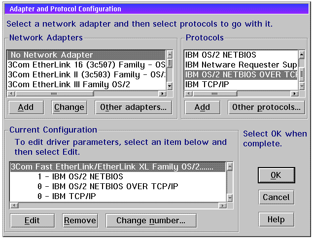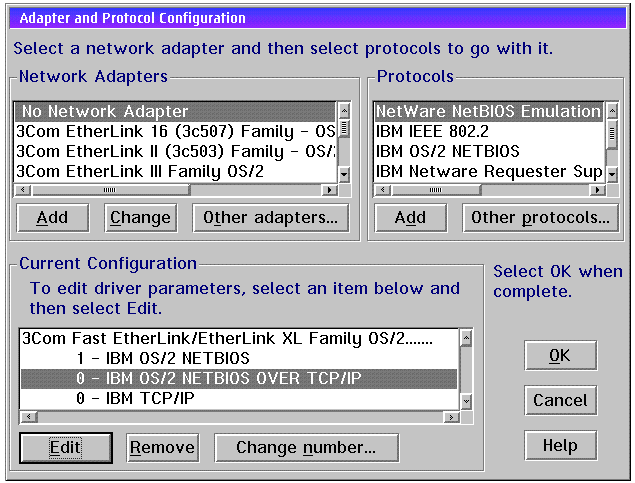 When you first see this dialog, there will only be two Protocols listed in the bottom window: IBM TCP/IP and IBM OS/2 NETBIOS. They will both be listed with a leading "0 -" as the IBM TCP/IP is shown above. This leading number is the logical adapter number. The fact that a single physical adapter can be treated as multiple logical adapters is the reason for the "M" in MPTS. It is necessary because you can't have two approaches to NetBIOS on the same logical adapter; thus, you must use the "Change number" button after adding the IBM NetBIOS over TCP/IP protocol to the Current Configuration list. According to the documentation, you shouldn't actually need to have the IBM OS/2 NetBIOS in the current configuration if you are not going to access devices on your local net. However, I found that I needed both protocols in the configuration -- although that may have been a consequence of other glitches that were eventually resolved. Unless you're trying to support 1000 connections (and you're running Warp Server), there's little lost by putting both in your configuration. The configuration program won't let you close this dialog box until the two NetBIOS protocols are assigned to different logical adapters, so you can't get out of here without changing one of them. According to the documentation, it doesn't matter which is assigned to adapter 1 or 0; this is my configuration. Once you have made these changes, you can select the OK, Close, and Exit buttons, respectively, to back out. NOTE: The install/configuration program will tell you to reboot at this point - DO NOT REBOOT. There are a couple more steps to be taken before you reboot. Step Three: Edit IBMLAN.INI(top) The MPTS Configure program should do this, but doesn't. Open the file \IBMCOM\PROTOCOL.INI, which can be found on your OS/2 boot drive. You should look for the ADAPTERn records (i.e., ADAPTER1= , ADAPTER2 =):