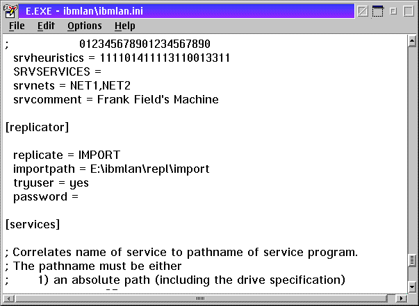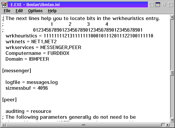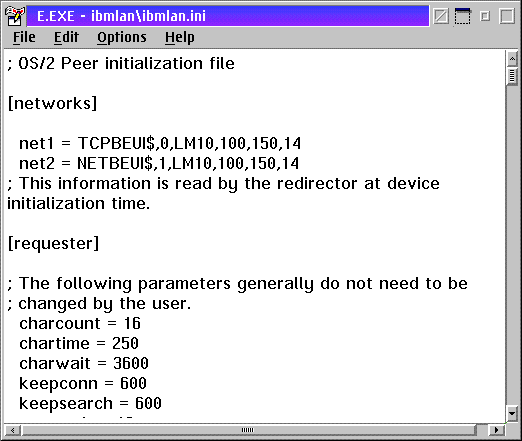The key thing is to verify which adapter is associated with plain NetBIOS (ADAPTER1 = netbeui$) and which is associated with NetBIOS over TCP/IP (ADAPTER0 = tcpbeui$). These values should correspond with your choices made in the MPTS configuration program, but it pays to check. What you need this for is the editing of the \IBMLAN\IBMLAN.INI file, again on your OS/2 boot drive. For whatever reason, the MTPS configuration program will NOT update this file correctly. When you open the IBMLAN.INI file, look at the beginning of the file for records like: net1=NETBEUI$,0,LM10,100,150,14